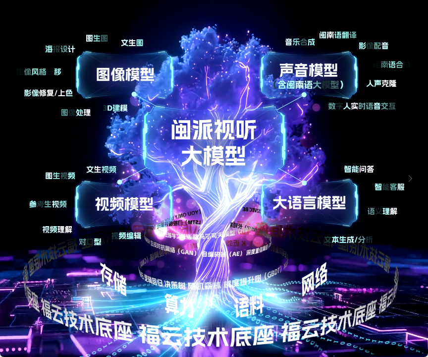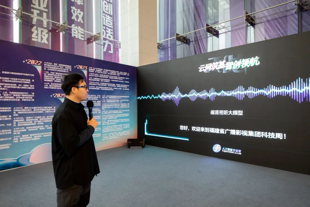 数据与技术底座展区是整个展览的核心亮点。闽南语交互数字人“杨小和”以地道的闽南语与参观者进行智能对话,并就闽派视听大模型开展交互体验。全省语料库展区汇聚该集团多年积累的海量、高质量数字资产,涵盖海丝、朱子、客家、妈祖、船政等闽派文化数据资源,规模全省最大、权威度最高。一旁的大模型动态科技树,以可视化形式集中呈现算力基础、算法、算子以及闽派视听大模型的多模态生成能力,充分展示福建省广播影视集团人工智能技术底座的硬核实力。