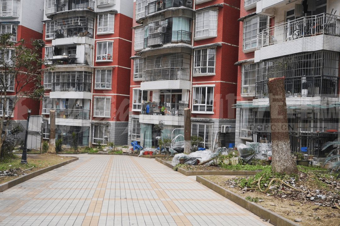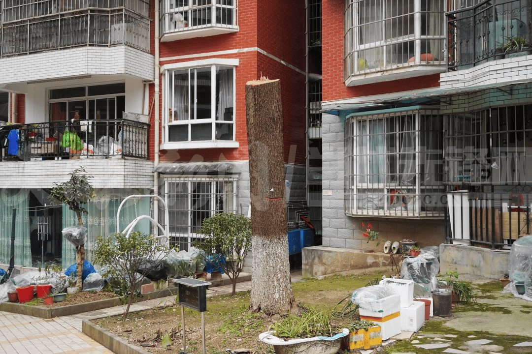 走进凤来仪小区,记者看到被处理的三棵大树确实枝叶全无,仅剩主干。从现场情况看,树干断口平整,明显是经过人工砍伐,周围还散落着一些养护工具和杂物。小区内道路由方砖铺就,两侧是红白相间的多层住宅楼,而这几棵失去树冠的树木与墙边零星的盆栽、绿植形成鲜明对比,部分区域看上去有些杂乱。